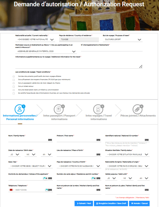 Le Ministère des Affaires Étrangères est responsable de l’AEVM. Si vous avez des questions ou avez besoin d’assistance ou d’aide, vous pouvez les contacter directement via le site www.acces-maroc.ma à travers leur formulaire de contact. L’Autorisation Électronique de Voyage pour le Maroc est une démarche rapide, simple et gratuite, qui vous permet de profiter sereinement de votre séjour, que ce soit pour la Coupe d’Afrique des Nations 2025 ou pour tout autre motif de voyage. Assurez-vous de respecter les délais et de soumettre les documents nécessaires en ligne pour éviter tout contretemps à votre arrivée. Voici ci-dessous les explications en arabe : تصريح السفر الإلكتروني إلى المغرب لكأس أمم إفريقيا 2025 تصريح السفر الإلكتروني (AEVM) هو إجراء جديد يُطلب من المواطنين من بعض الدول الإفريقية، مثل تونس والجزائر، الحصول عليه للدخول إلى المغرب. تم تطبيق هذا النظام بشكل خاص في إطار استضافة المغرب لكأس أمم إفريقيا 2025، بهدف تسهيل دخول المشجعين والزوار خلال فترة الحدث من الضروري أن يحصل المواطنون من الجزائر وتونس والدول الإفريقية الأخرى (مثل السنغال، بوركينا فاسو، النيجر، وغيرها) على AEVM للدخول إلى المغرب في الفترة من 25 سبتمبر 2025 إلى 25 يناير 2026. ومع ذلك، هناك استثناءات تشمل حاملي جوازات السفر الدبلوماسية والمقيمين في المغرب. لتقديم طلب للحصول على AEVM، يجب على الزوار زيارة الموقع الرسمي للمغرب: acces-maroc.ma. يمكنهم أولاً التحقق من أهليتهم، ثم تعبئة نموذج الطلب وتحميل الوثائق المطلوبة، والتي تشمل جواز السفر ساري المفعول، تذاكر الطيران (الذهاب والعودة)، حجز فندقي أو إثبات مكان الإقامة في المغرب، وصورة شخصية حديثة. L’AEVM est une autorisation électronique nécessaire pour certains voyageurs entrant au Maroc, obligatoire pendant des périodes spécifiques comme la CAN 2025. Non, l’AEVM est gratuite et n’entraîne aucun frais. Non, l’AEVM est valable pour un seul voyage. Si vous souhaitez retourner au Maroc, vous devrez faire une nouvelle demande. Il est recommandé de faire votre demande au moins 96 heures (4 jours) avant votre départ.Assistez à la CAN 2025 au Maroc