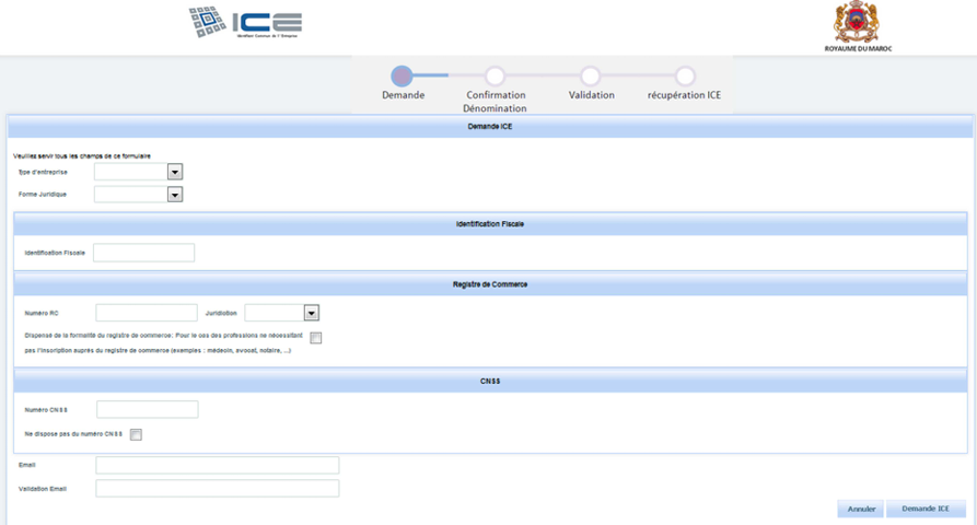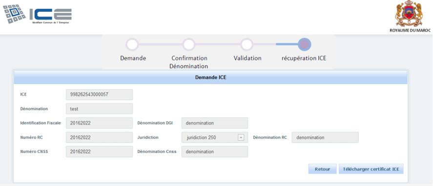 L’ICE est attribué automatiquement lors de la demande de certificat négatif via l’OMPIC (Office Marocain de la Propriété Industrielle et Commerciale). Il est inscrit sur le certificat négatif et requis pour la création de l’entreprise.