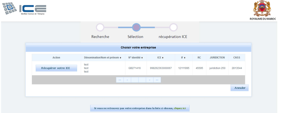 Si l’entreprise est trouvée, la liste affichera les informations nécessaires comme la dénomination sociale, l’ICE, l’IF, le RC, et le numéro CNSS ; sinon, vous pourrez compléter vos informations pour faire une demande.