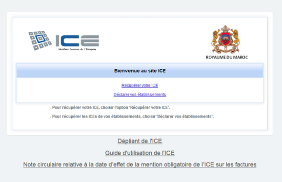 Rendez-vous sur le site www.ice.gov.ma pour récupérer votre ICE ou déclarer vos établissements.