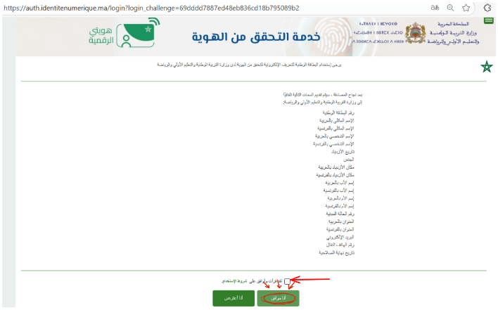 - Vérifier que toutes les informations sont correctes. Important : après avoir cliqué sur « مصادقة » (validation), vous ne pourrez plus modifier votre demande.