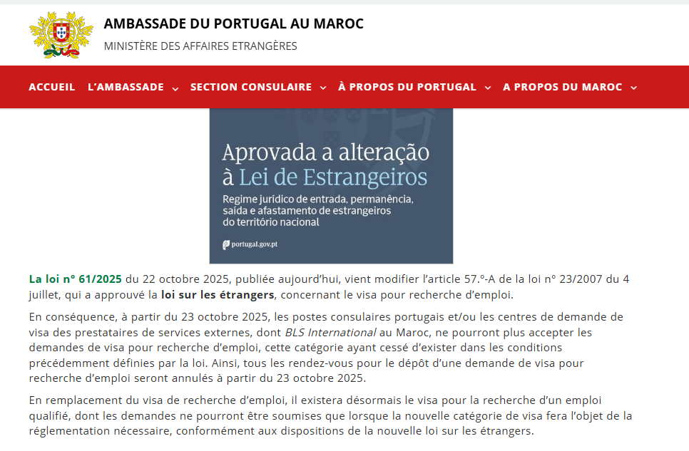 La visa de recherche d’emploi classique n’existe plus. À partir du 23 octobre 2025, les consulats portugais et les centres partenaires, y compris BLS International, n’accepteront plus aucune demande. Tous les rendez-vous de cette ancienne catégorie seront automatiquement annulés.